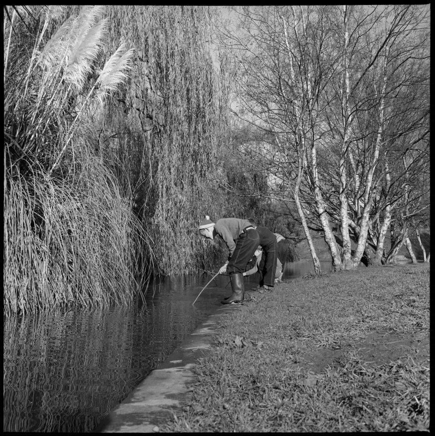 This image was taken for a story that ran in The Manawatu Evening Standard on 05 June 1961 "The frost today had many people wondering how far away the snow and ice was. Small boys in Memorial Park this morning were taking advantage of the holiday to see if any ice existed in the small lake. They hunted and poked around with sticks, but found nothing."