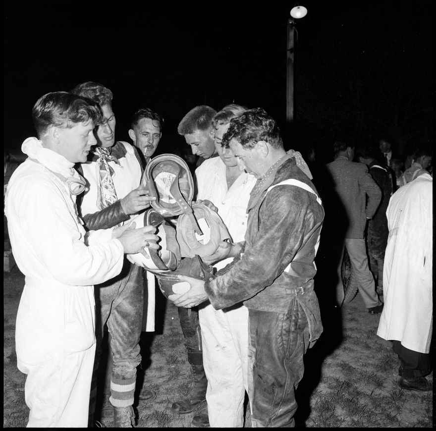 Mrs. L. Myers, the widow of the late Mr. Lindsay Myers, who was fatally injured in an accident at a speedway meeting on February 18, will receive £215 as a result of a collection taken by riders and T.Q. drivers at the speedway meeting on Saturday night. The riders and drivers passed through the crown during the interval at the meeting, and the contributions were placed in their crash helmets. The figure was announced by the organisers at the conclusion of the meeting. The photograph shows some of the competitors tipping the money into one basket. They are (from the left): R. Briggs, B. Overton, M. Parkins, M. Whitehead, A. Clark and N. Gordon (pit steward).