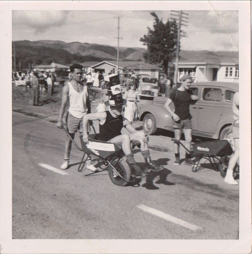 Start of wheelbarrow race outside Ramsay's Dairy Napier Road Ashhurst