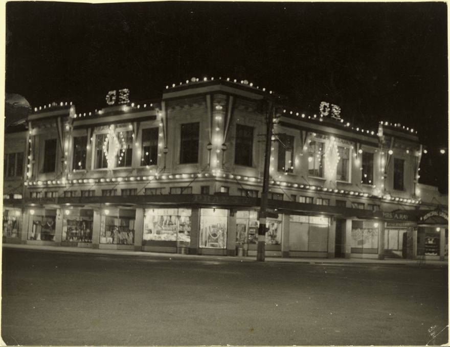This building was the fourth public library in Palmerston North and was purpose built by the PNCC in 1928. The Library was originally housed upstairs and offices and shops occupied the ground floor, but in later years it expanded into some areas downstairs until a new library was built in 1965. The building has since been demolished. Here it is illuminated for the Coronation of George VI.