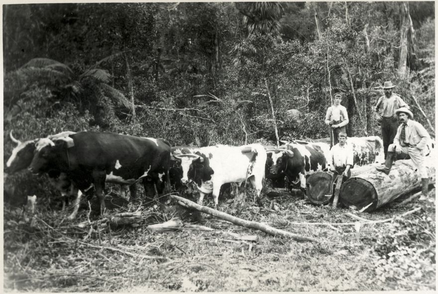 This photograph shows a bullock team hauling logs in the Shannon district. The four men are unidentified.
