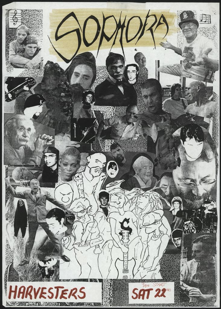 Sophora. Harvesters. 9am start. Sat 22nd. Part of a collection of posters that were displayed at The Stomach, Lombard Street, venue for Creative Sounds Society Incorporated.