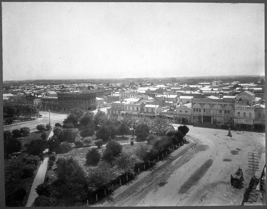 Buildings, from left: Nash building?; ?; ?; Garner Brothers; ?; Cyril K Whale; J B Wilton; Star Cycles; Commercial Hotel; Cameron's Royal Hotel; the New Zealand Clothing Factory; ? ; ? Tobacconist; Thacker; De Luen Brothers - Tailors; Stockwell Dentists; Leopold Simmons - Family Drapery Warehouse; J Kwong Lee