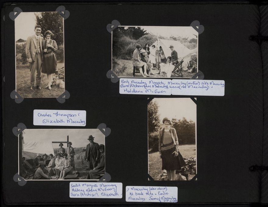 Album contains photographs mainly of the Auckland area, Charles and Elizabeth Thompson and their children (Beth, Elayne and Maurice), Macauley family, Thompson home and farm on Milson Line, Bunnythorpe factory and sub-station, Wanganui and Flock House