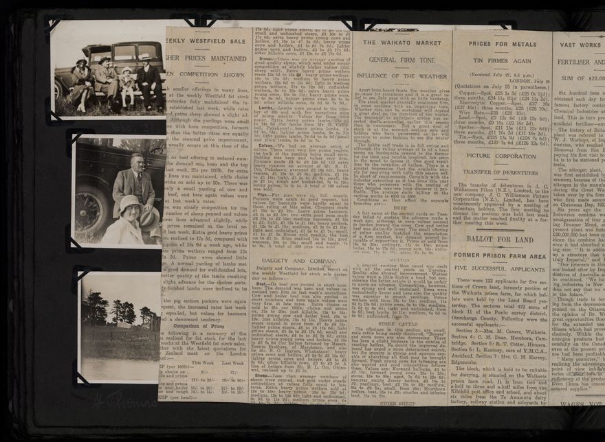 Album contains photographs mainly of the Auckland area, Charles and Elizabeth Thompson and their children (Beth, Elayne and Maurice), Macauley family, Thompson home and farm on Milson Line, Bunnythorpe factory and sub-station, Wanganui and Flock House