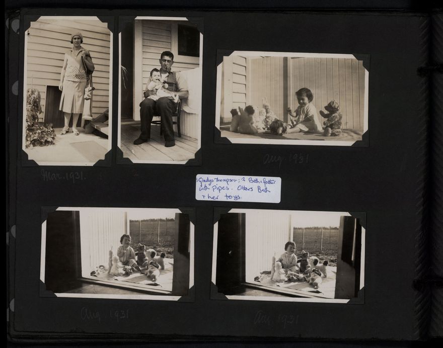 Album contains photographs mainly of the Auckland area, Charles and Elizabeth Thompson and their children (Beth, Elayne and Maurice), Macauley family, Thompson home and farm on Milson Line, Bunnythorpe factory and sub-station, Wanganui and Flock House