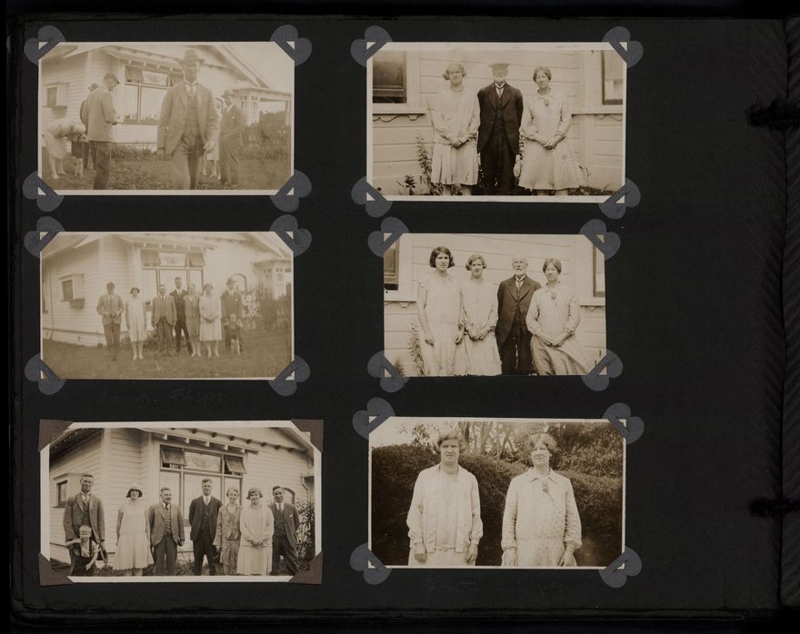 Album contains photographs mainly of the Auckland area, Charles and Elizabeth Thompson and their children (Beth, Elayne and Maurice), Macauley family, Thompson home and farm on Milson Line, Bunnythorpe factory and sub-station, Wanganui and Flock House