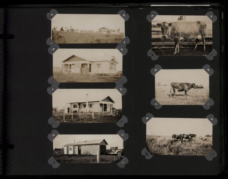 Album contains photographs mainly of the Auckland area, Charles and Elizabeth Thompson and their children (Beth, Elayne and Maurice), Macauley family, Thompson home and farm on Milson Line, Bunnythorpe factory and sub-station, Wanganui and Flock House
