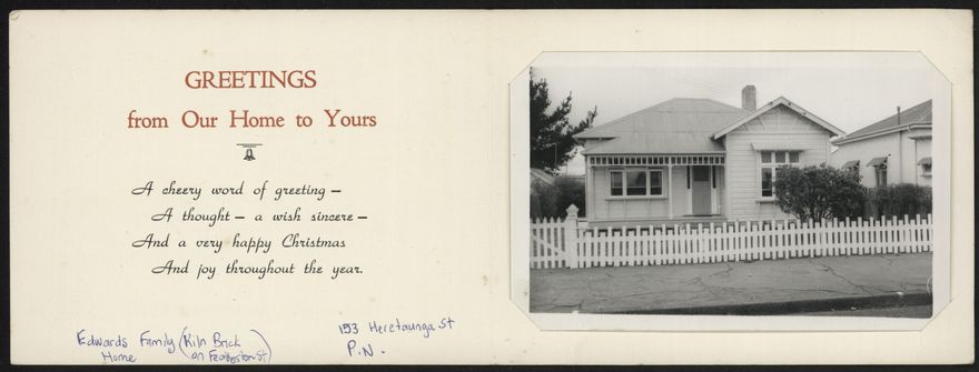This Christmas card shows the Edwards family home at 153 Heretaunga Street.