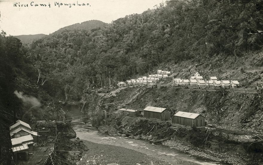 Mangahao river camp located on a terrace above the river and associated project workings.The Mangahao Power Station provides hydroelectric power and is situated near the town of Shannon. It serves Wellington, Horowhenua, Taranaki, Hawkes Bay, and the Wairarapa. After being delayed by the first world war construction began in late 1919 and the station opened in November 1924.