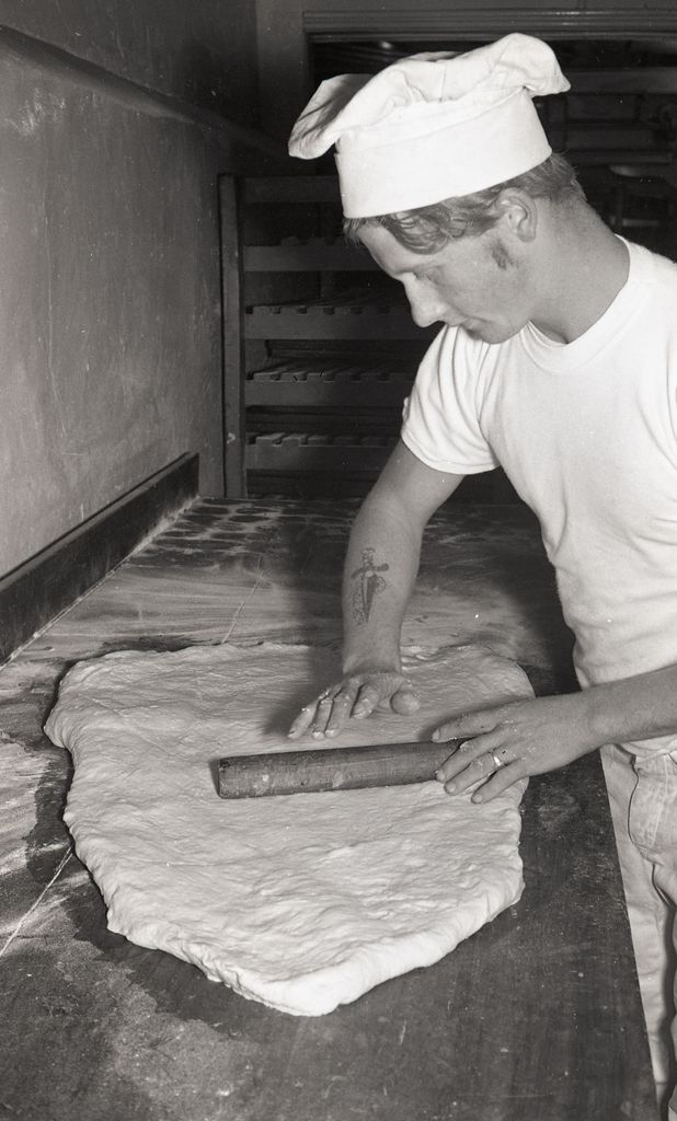 Caption: "The Manufacture of Bread - An Essential Food. The bread we eat each day is one of the many things we take for granted and Photorama on these three pages shows the process needed in the manufacture of bread. Bridewell Bakery Palmerston North and Levin is one of five bakers in this area who bake every night five nights a week producing our daily bread. This firm with a staff of 17 in Palmerston North and 11 in Levin turn out well over two million loafs of bread a year."