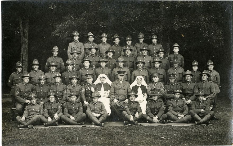 Awapuni Racecourse was home to one of New Zealand’s largest training camps in World War One, and was the sole location for training the New Zealand Medical Corps. staff. Henry Ward is seated front row, far right.