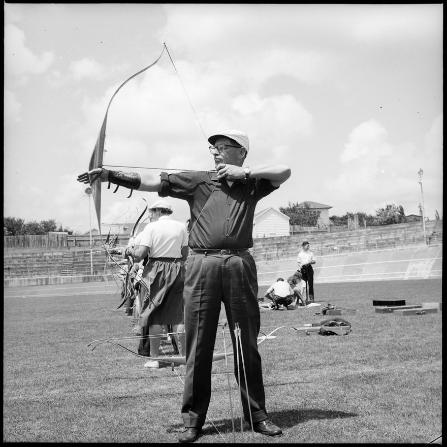 This image was taken for a story that ran in The Manawatu Evening Standard on 20 January, 1963. "H. Fuller (Wellington), the Wellington provincial archery champion, shows the style which won him the individual competition during the weekend championships."