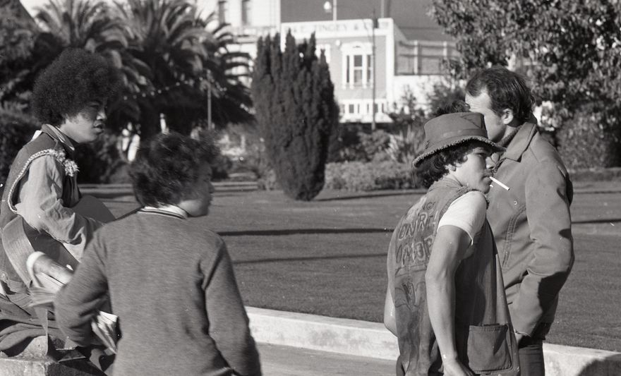 This image was taken (but not used) for a story that ran in The Manawatu Evening Standard on the 30th of April 1970. "Between 40 and 50 people have kept a 'peace vigil' at the Palmerston North Cenotaph since mid-day yesterday - with the Hastings 'Mongrel Mob' in attendance for 'protection' and leaflet distribution.