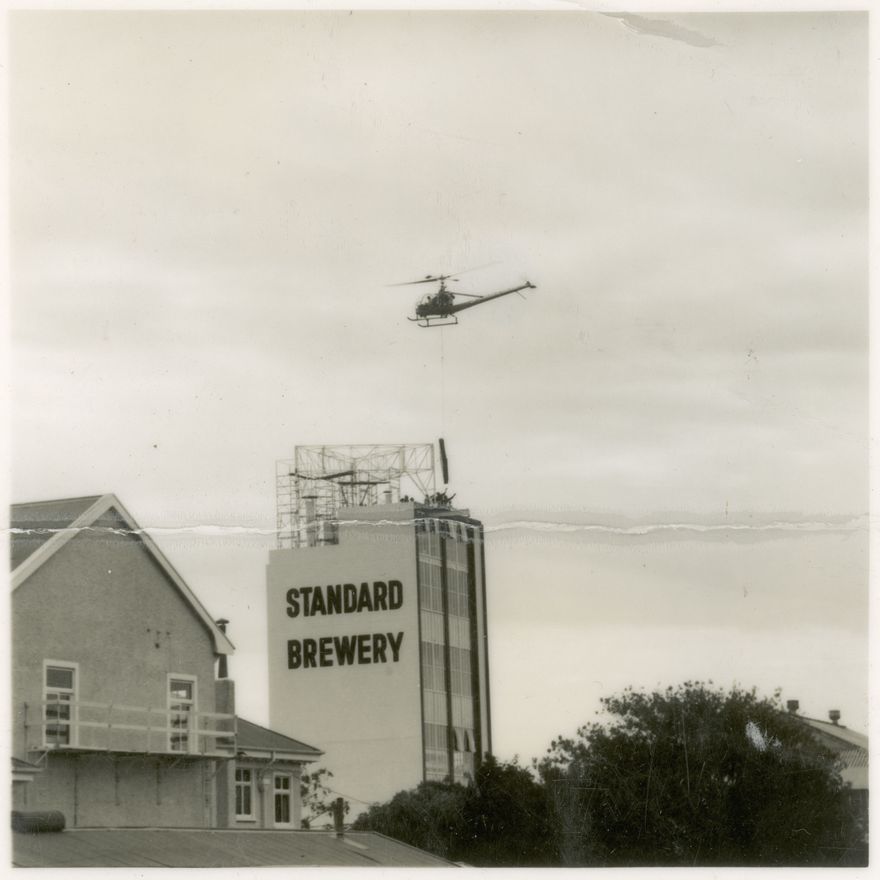 A helicopter flies framing and signage to its location ontop of the Standard Brewery building in December 1964. The brewery was located on the corner of Elizabeth and Featherston Streets. The facility was later operated as a branch of Lion Breweries until its closure in September 1985. The building was demolished in 1992. These photographs were later laminated, resulting in fuzziness and visible creases in some of the images.