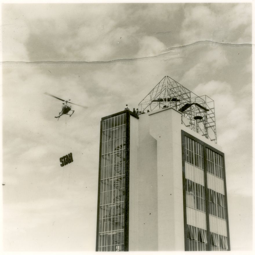 A helicopter flies framing and signage to its location ontop of the Standard Brewery building in December 1964. The brewery was located on the corner of Elizabeth and Featherston Streets. The facility was later operated as a branch of Lion Breweries until its closure in September 1985. The building was demolished in 1992. These photographs were later laminated, resulting in fuzziness and visible creases in some of the images.