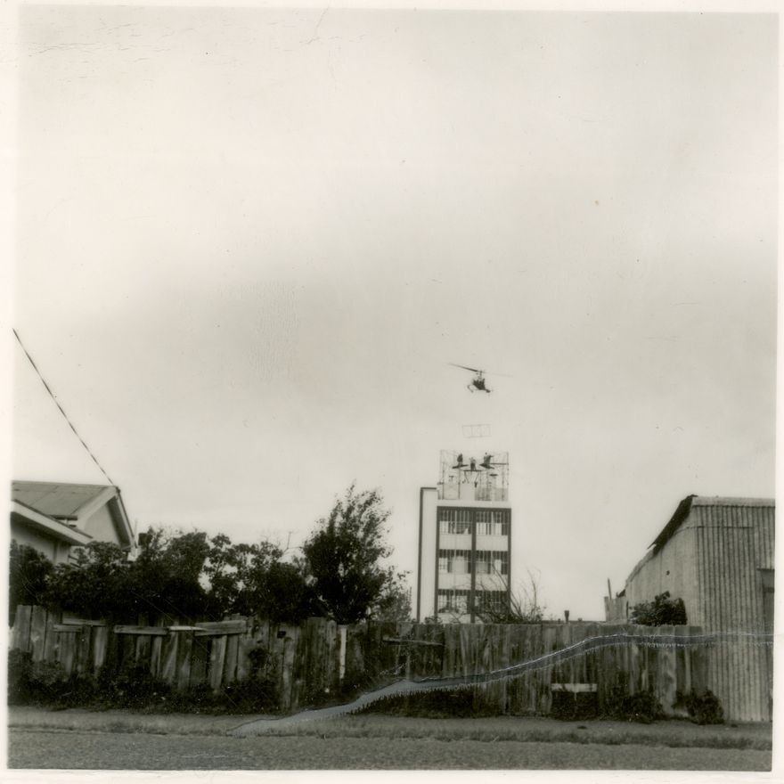 A helicopter flies framing and signage to its location ontop of the Standard Brewery building in December 1964. The brewery was located on the corner of Elizabeth and Featherston Streets. The facility was later operated as a branch of Lion Breweries until its closure in September 1985. The building was demolished in 1992. These photographs were later laminated, resulting in fuzziness and visible creases in some of the images.