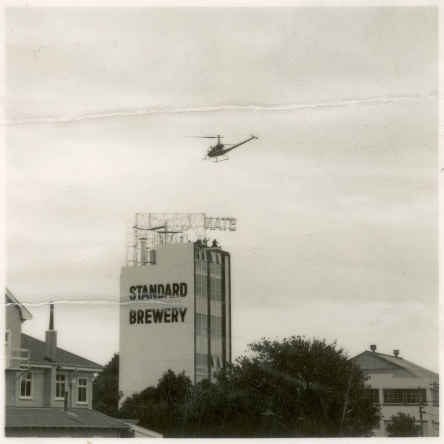 A helicopter flies framing and signage to its location ontop of the Standard Brewery building in December 1964. The brewery was located on the corner of Elizabeth and Featherston Streets. The facility was later operated as a branch of Lion Breweries until its closure in September 1985. The building was demolished in 1992. These photographs were later laminated, resulting in fuzziness and visible creases in some of the images.