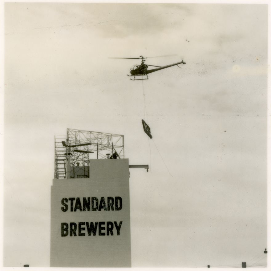 - A helicopter flies framing and signage to its location ontop of the Standard Brewery building in December 1964. The brewery was located on the corner of Elizabeth and Featherston Streets. The facility was later operated as a branch of Lion Breweries until its closure in September 1985. The building was demolished in 1992. These photographs were later laminated, resulting in fuzziness and visible creases in some of the images.