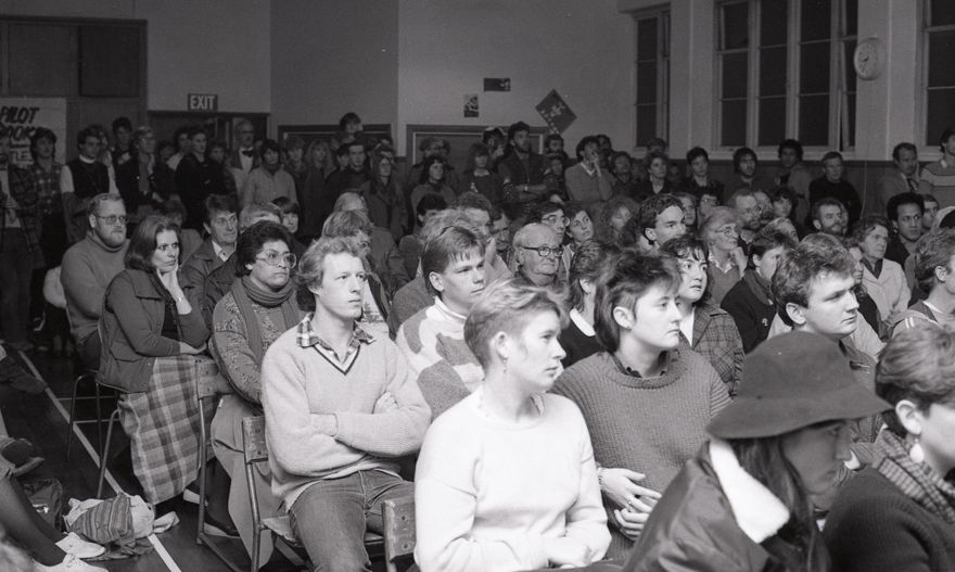 Some of the 300-strong audience who filled the YMCA hall in Palmerston North last night to hear speakers, including Wellington Central MP Fran Wilde … support the Homosexual Law Reform Bill.”