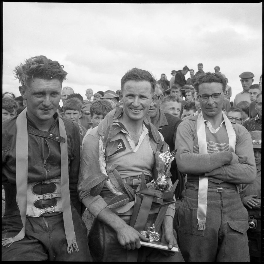 - This image was not published in The Manawatu Evening Standard, taken on 3 February, 1964. [Image from the Woodville Moto-Cross Grand Prix in February, 1964. The three men are presumably the winners of the event.]