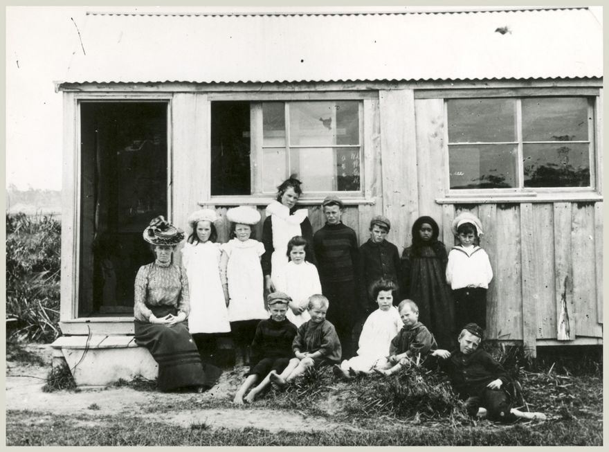 This photograph shows the students at Himatangi Mill School, which opened in September 1903.