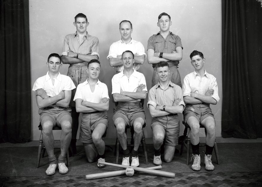 The Co-op baseball team pose for a team photograph. The Manawatu Cooperative Society operated from 1935-1988, based on British models which returned profits to member shareholders by rebates on purchases. ‘The Co-op’ began with a grocery store in Broadway Avenue and developed a chain of grocery stores and butcher shops which operated in most suburbs.