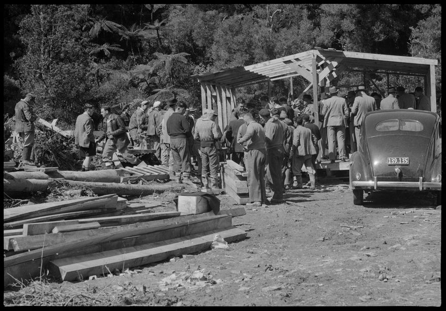"Turitea dam G. Tremaine turning first sod. Groups with G. Hogg, Engineer and function on site at sod turning."