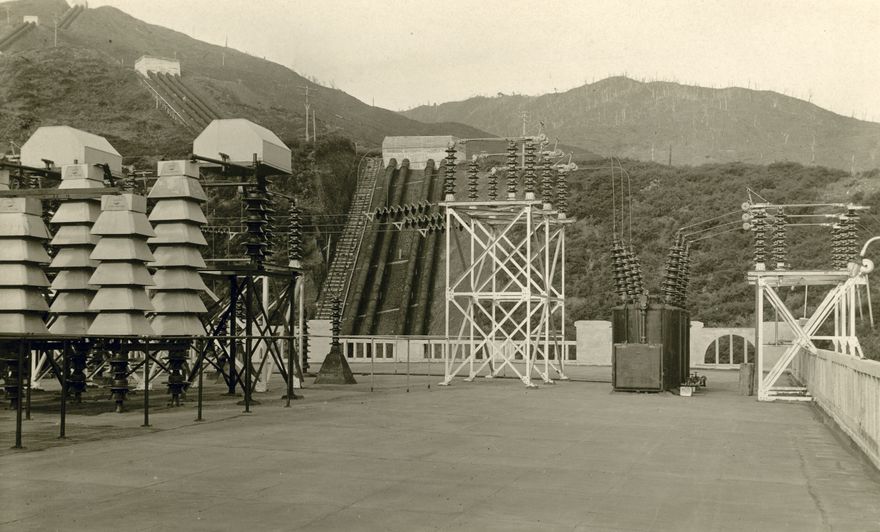 Shown here is the roof of the power station in the back ground can be seen the pipelines which carry water to the power station. The Mangahao Power Station provides hydroelectric power and is situated near the town of Shannon. It serves Wellington, Horowhenua, Taranaki, Hawkes Bay, and the Wairarapa. After being delayed by the first world war construction began in late 1919 and the station opened in November 1924.