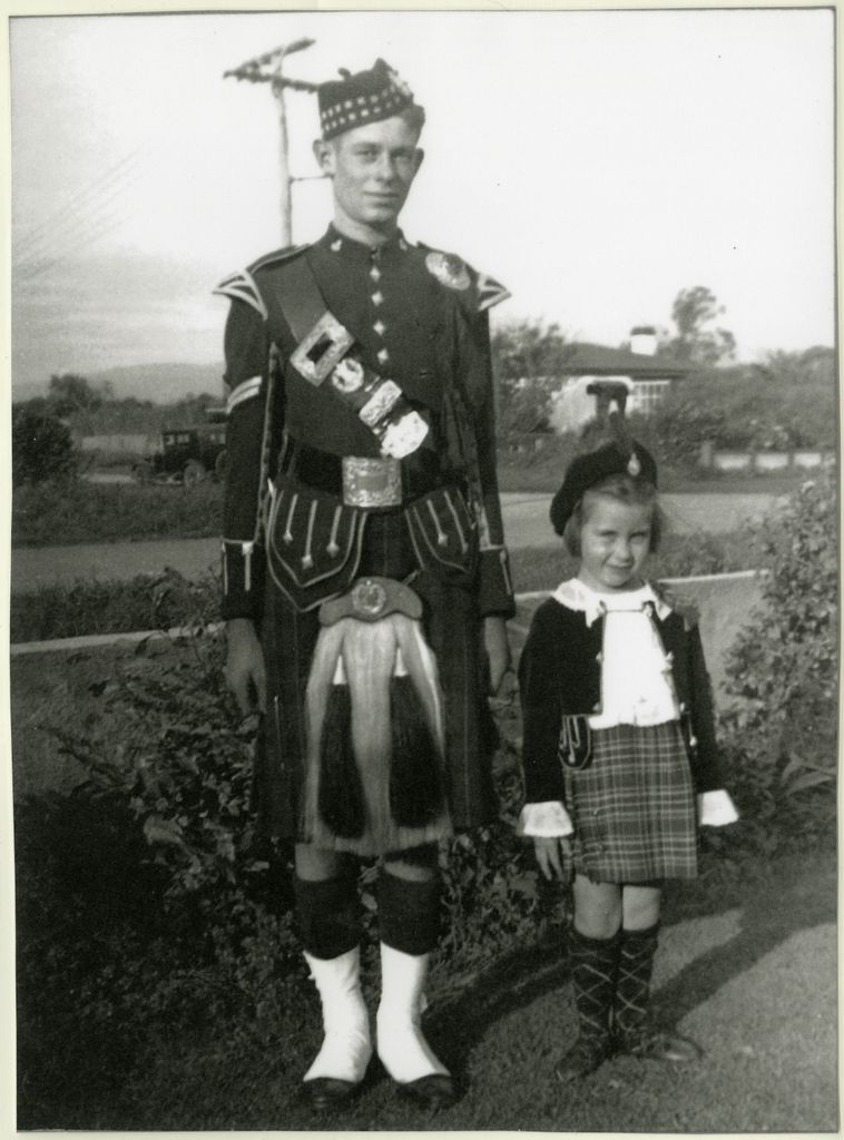 Merlin Sampson with her brother Brian, dressed in his pipe band uniform, photographed on the corner of Ruahine and East Street across the street from their family home.
