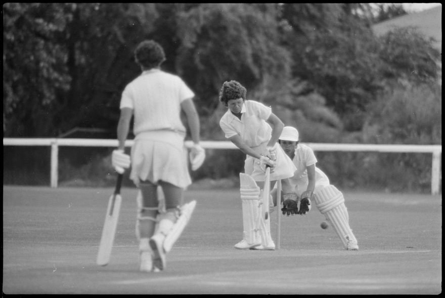 This image was taken (but not used) by the Evening Standard on 21st of January 1982. It depicts the New Zealand women’s cricket team taking on the International XI women’s team in a limited over match for the Hansell's Vita Fresh Women's World Cup 1981/1982. The match was held at Fitzherbert Park in Palmerston North. The New Zealand team won by 97 runs.