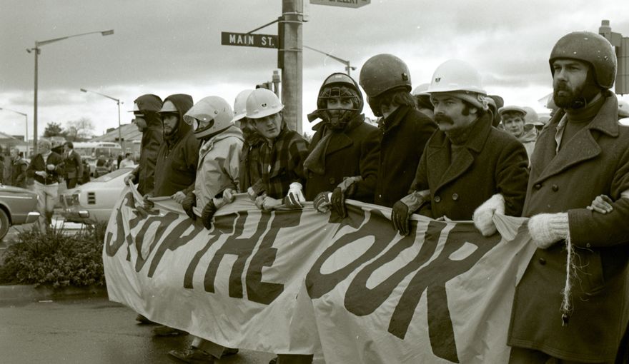 This image was taken (but not used) for a story that ran in The Manawatu Evening Standard on 01 August 1981, depicting the march in protest of the rugby match played between the South African Springboks and the Manawatū provincial team. The march was a coalition of organised responses from representatives and marshalls of COST (Citizens Opposed to the Springbok Tour), MAST (Manawatū Against the Springbok Tour) and HART (Halt All Racist Tours) and attracted participants from within the city but also from Wellington and Auckland. HART founder Trevor Richards appears second from right.