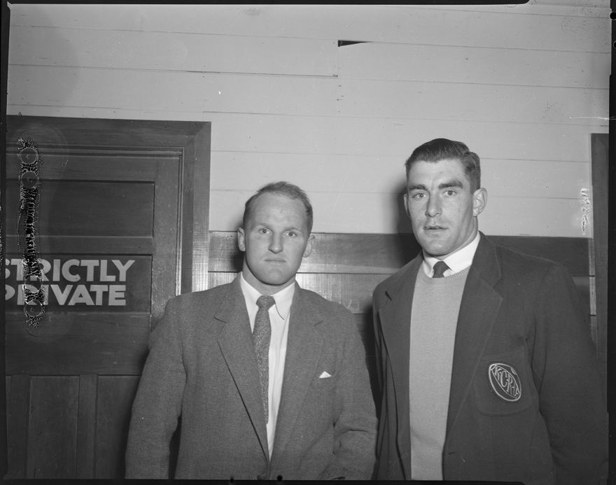 This image was taken for a story that ran in The Manawatu Evening Standard on 31 July 1958, page 12: C.E. Meads of King Country and W.J. Whineray performed well in the All Black trials: "Whineray surprised even the Palmerston North spectators who hailed him as a future All Black two years ago, when he was then a student at Massey College. Like Meads, he has progressed so fast that there is a no more vigorous player and able captain to be sought anywhere in the Dominion."
