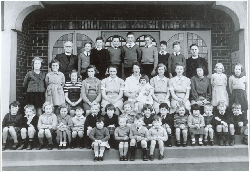 Staff identified as: Back row, far left - Canon Woodward; Middle row, from 5th person, from left - Jan Cooke, Miss Bellingham, Betty Wallace, Olga Peterson.