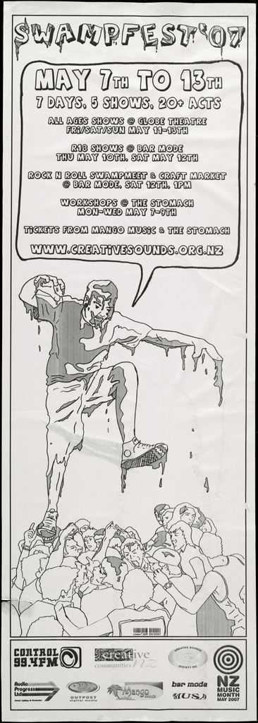 Swampfest '07. May 7th to 13th. 7 days, 5 shows, 20 acts. All ages shows, Globe theatre, Fri/Sat/Sun may 11th-13th. R18 shows, Bar mode. Thu May 10th, Sat May 12th. Rock n roll swampmeet, craft market, Bar Mode, Sat 12th, 1pm. Workshops, The Stomach, Mon-Wed May 7-9th. Tickets from Mango Music, The Stomach. www.creativesounds.org.nz. Part of a collection of posters that were displayed at The Stomach, Lombard Street, venue for Creative Sounds Society Incorporated.