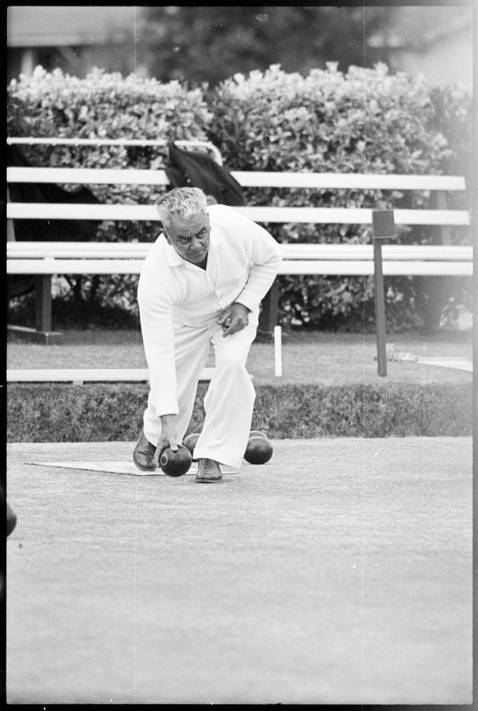 This image was taken for a story that ran in The Manawatu Evening Standard on 28th December 1965 "In section C of the Manawatu Bowling Centre's pairs tournament H. Huff (Foxton) at the end of play yesterday, had won all his six games."