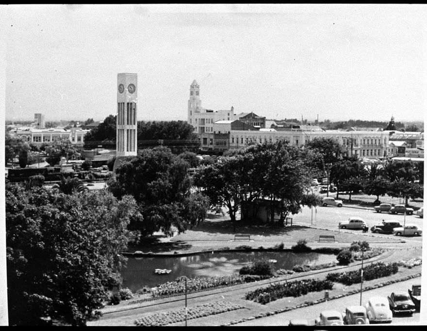 The Lakelet was constructed in October 1909. It was the main feature of the last quadrant of The Square to be developed by the Beautifying Society. The Hopwood Clock Tower was built in 1957, built with a donation from Arthur Hopwood. The clock chimes contained therein were moved from the Post Office tower when it was demolished as an earthquake risk after the 1940 earthquake. The Hopwood Clock Tower has experienced a number of changes including the removal of the original sound shell at the base of the tower (just visible in this photograph) in the early 1990s and the addition of a cross. During 2007 the Hopwood Clock Tower was refurbished and it is now topped with a lantern style cross. The T&G (Australasian Temperance and General Mutual Life Assurance Society) Building (topped with a clock tower to the right of the Hopwood Clock Tower) was built in 1938.