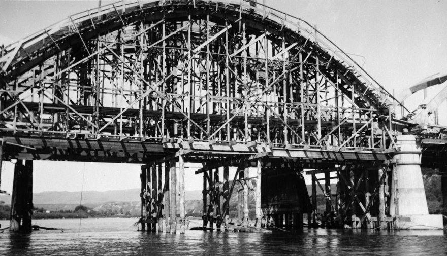 One of the concrete arches under construction during the building of the Fitzherbert Bridge, Palmerston North.