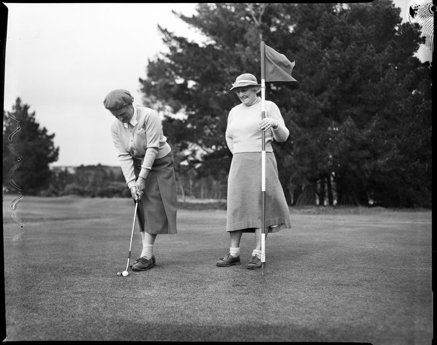 This image was taken for a story that ran in The Manawatu Evening Standard on 09 September 1958: "Players from Hawera, Feilding and Palmerston North competed in the Manawatu women's open golf championships which began at Hokowhitu today. Mrs. E. Trail is seen taking a putt. Mrs. F. Souness is holding the flag."