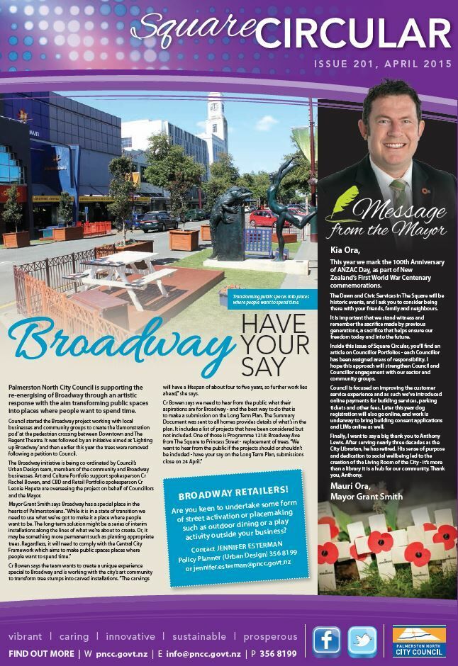 The Square Circular was Palmerston North City Council's monthly community publication, informing Palmerstonians of PNCC initiatives, activites, and events. This month's issue includes: Broadway Avenue businesses; Grant Smith; food waste; civil defence; Esplanade playground; voting; online payments; Festival of cultures; local alcohol policy; archives; Linklater Reserve; new council portfolios; councillor contact details; council meetings.