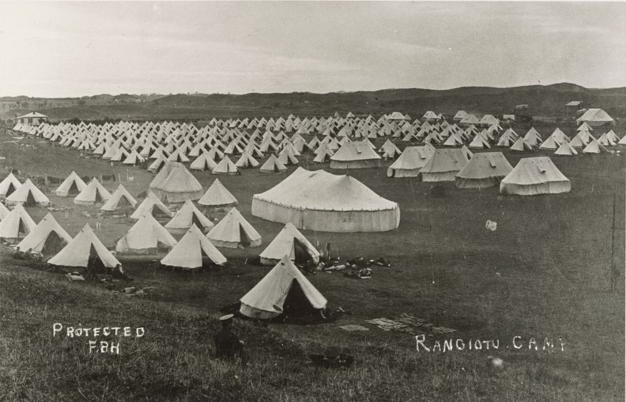 During World War One Manawaroa Te Awe Awe offered the Government the use of part of his farm for a training camp, to replace the camp at Trentham (Wellington) which had been evacuated. Samuel Jickell, Palmerston North Borough Council Civil Engineer, prepared a comprehensive report on the drainage, sanitation and water supply of Trentham Military Camp, and when he laid out the Rangiotu camp near Palmerston North in 1915 he made sure that the poor conditions at Trentham were not repeated. During 1915 men from the 1st & 2nd New Zealand Rifle Brigade and the Earl of Liverpool’s Own Regiment used the land. Initially the camp was situated where the Rangiotu School was but later it moved 1 mile west, opposite Pyke’s Road. The entire camp was moved by hand and occupied approx. 3000 acres and could accommodate 2,000 men. To avoid cutting up the ground, no wheeled vehicles were allowed in the camp.