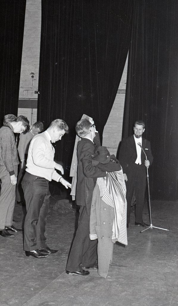 Caption: "International Hypnotist Janus Vroegryk had dozens out on the stage when he visited P.N. recently on a tour of the country. A packed house attended the Saturday Performance."