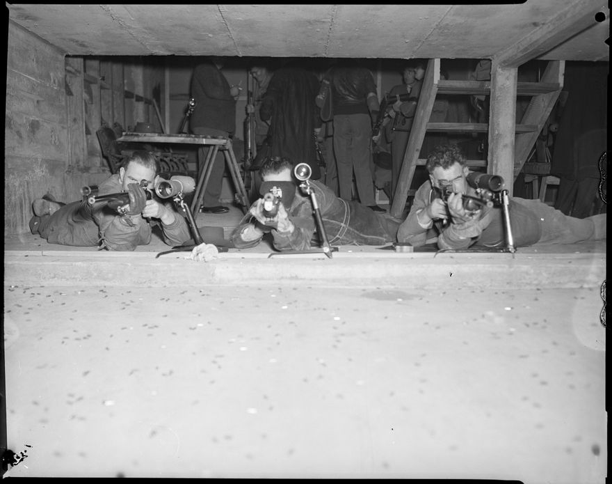 This image was taken for a story that ran in The Manawatu Evening Standard on May 31 1958, page 10: "This weekend smallbore rifle clubs have gathered at Palmerston North for the North vs. South Island championship shoot. This photograph shows some of the contestants in the first 10-shot shoot of the day. From left are: K. McDowell (Wellington), R. Weston (Christchurch), who is using a Hammill rifle, bolt action (Swiss made), the only one of its kind in the championships, and N. A. Rees (Palmerston North)"