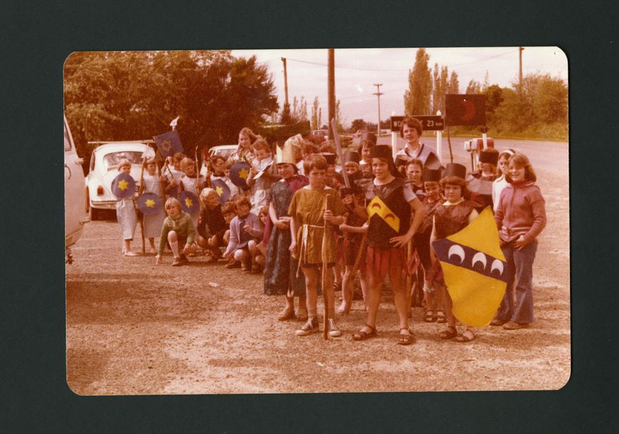 A group of pupils form Aokautere School wear costumes and hold painted shields, possibly as part of a teaching unit of Medieval Europe. Aokautere School (formerly known as Fitzherbert East School) was established in 1889.