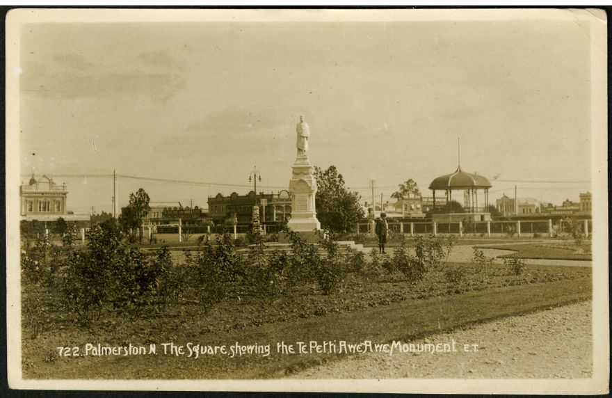 "Looking across The Square with Te Peeti Te Awe Awe memorial in foreground, past the Band Rotunda to Main Street (with Childs Hotel on corner).