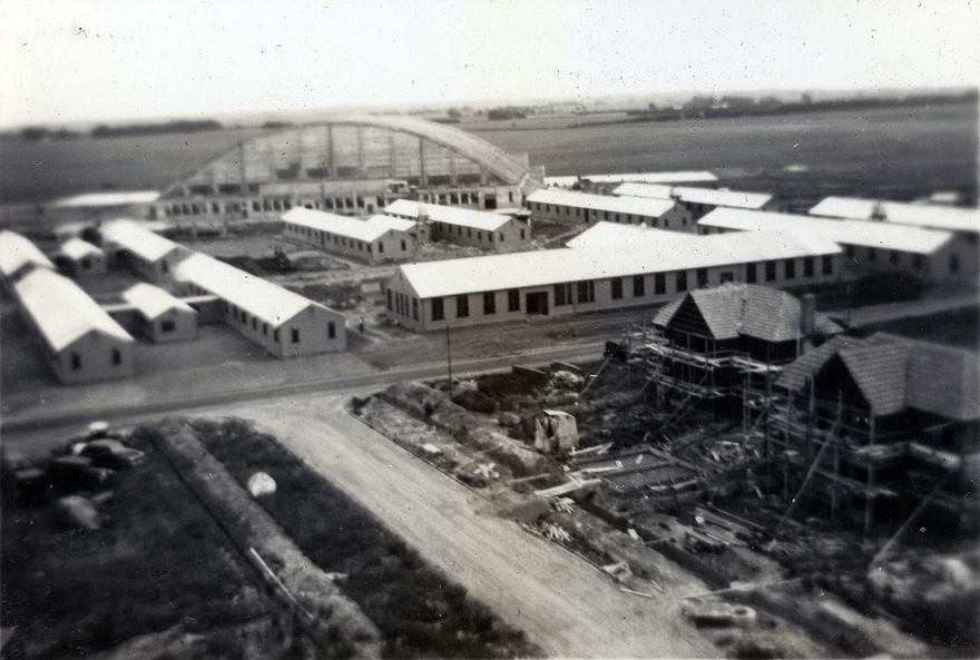 Ohakea Air Force Base was constructed on land near Bulls in the Manawatu, 1937 to 1939. It was built in anticipation of the arrival of bombers, ordered for delivery in October 1939. The initial construction included housing and maintenance facilities for the new bombers, workshops, administration buildings and accommodation for servicemen and dependents. The image shows the construction of two storey houses for officers in the foreground, barrack blocks and the construction of one of the hangers in the background. Photograph found in album related to the Humphries family of Greytown.