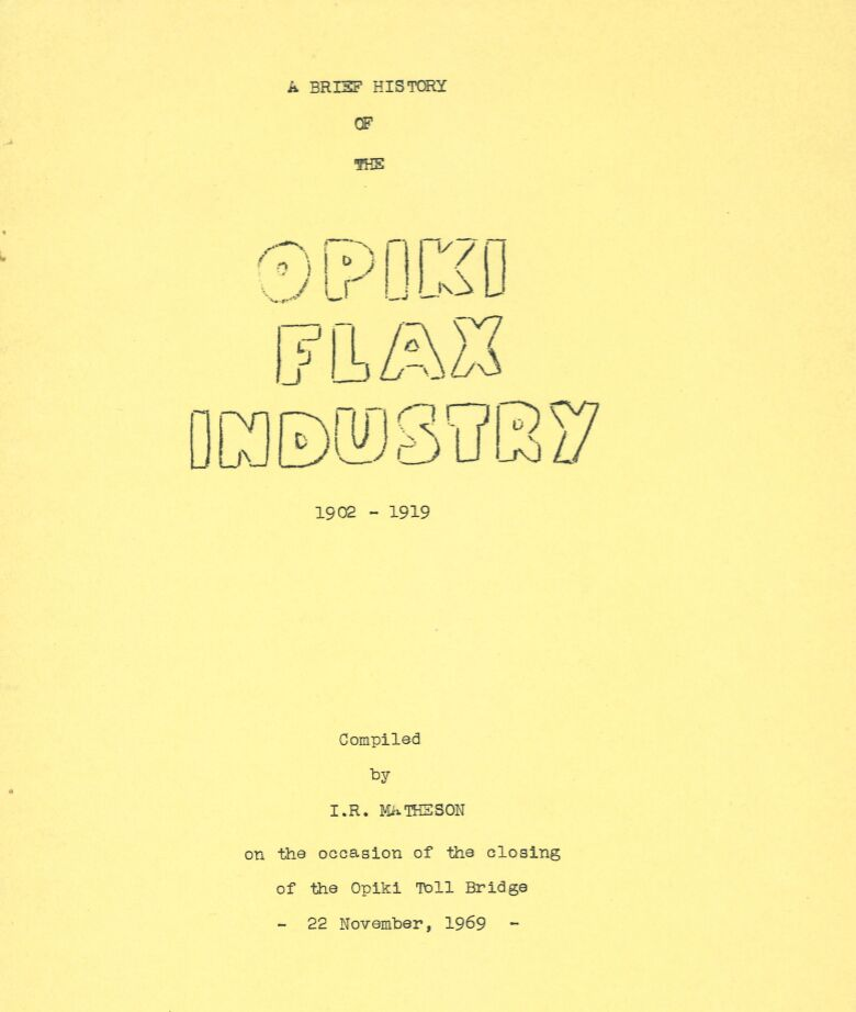 A Brief History of the Opiki Flax Industry (1902-1919), compiled by Ian Matheson on the occasion of the closing of the Opiki Toll Bridge, 22 November 1969.