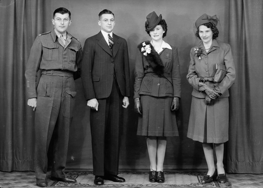 Unidentified wedding photograph of bride, groom, bridesmaid and groomsman. The groomsman is wearing an army uniform. Also see 2013N_ELMAR-B6_007300
