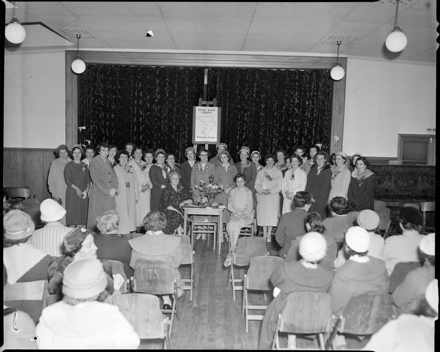 This image was taken for a story that ran in The Manawatu Evening Standard on 28 September 1960 "A group of the leaders of the Anglican Young Wives' Groups in the Northern Diocesan area who attended the annual festival held in the All Saints' Memorial Hall last evening. Seated (from the left) are Mrs. Geary (secretary of the Archdeaconry), Mrs. L.M. King (chairman of the Northern Diocesan) standing centre, and Miss A. E. Robertson, the guest-speaker."