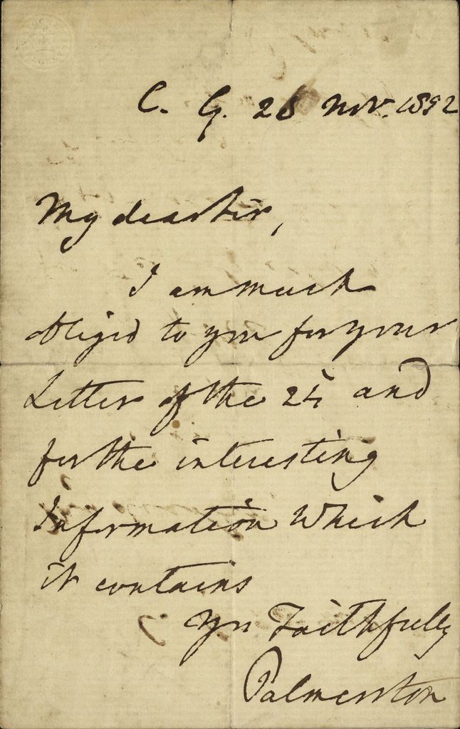 Lord Palmerston (1784-1865), after whom Palmerston North was named, was born Henry John Temple, son of Viscount Palmerston. He served as a British Member of Parliament, in high office and then Prime Minister, almost continuously from 1807 to his death. The donor of the Lord Palmerston collection, F C Holland of England, (who was interested in philately and postal history) donated items related to Lord Palmerton during the 1970s, after visiting Palmerston North.Transcription of letter: C. G. 28 November 1892. My dear Sir, I am much obliged to you for your letter of the 24th and for the interesting information which it contains. yours faithfully, Palmerston